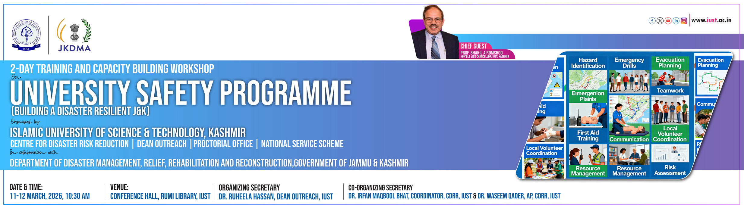 At the Islamic University of Science and Technology (IUST), the Centre for Disaster Risk Reduction (CDRR) was established in 2024 with the objectives to; undertake cutting-edge research on potential disasters, train the community through knowledge sharing, workshops, capacity building programs, etc. about the risks involved with the potential disasters, foster a culture of resilience, and to promote sustainable development for the present and future generations. In addition, our aim is to build working partnerships with the other national and international institutes. Disaster Risk Reduction focuses on the various components of risk, viz., hazard, exposure and vulnerability of people and assets. We are currently running an interdisciplinary Ph.D. program, offering unparalleled opportunities for aspiring scholars to delve into cutting-edge disaster related research involving multi-hazard approach.